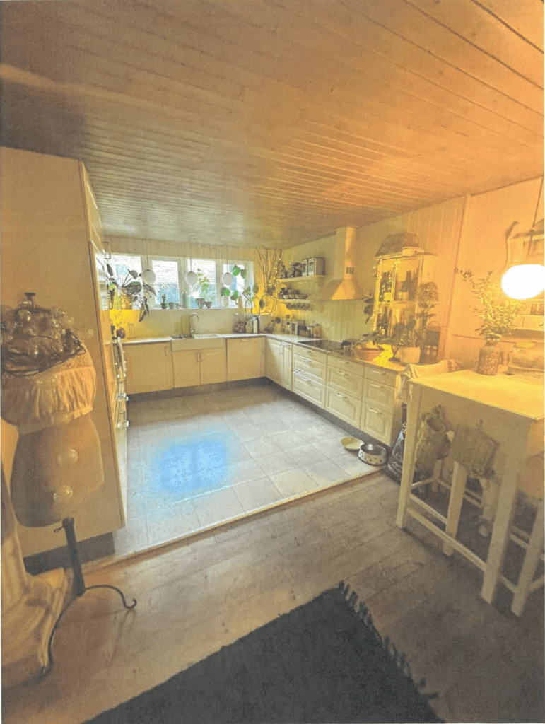 Ejendommen er under renovering, hvorfor bl.a. loft mangler i et værelse samt skabe mv. i køkkenet. Der er anvendt forskellige materialer, herunder fx linoleumsgulv i køkkenet, gulvtæppe i stuen mv.