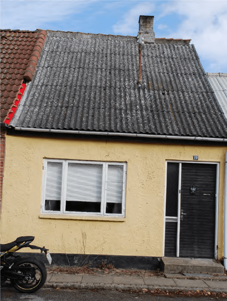 Tagdækningen er i BBR-meddelelsen oplyst som tegl, men fremstår i plader, som kan være eternit, men det vides ikke.