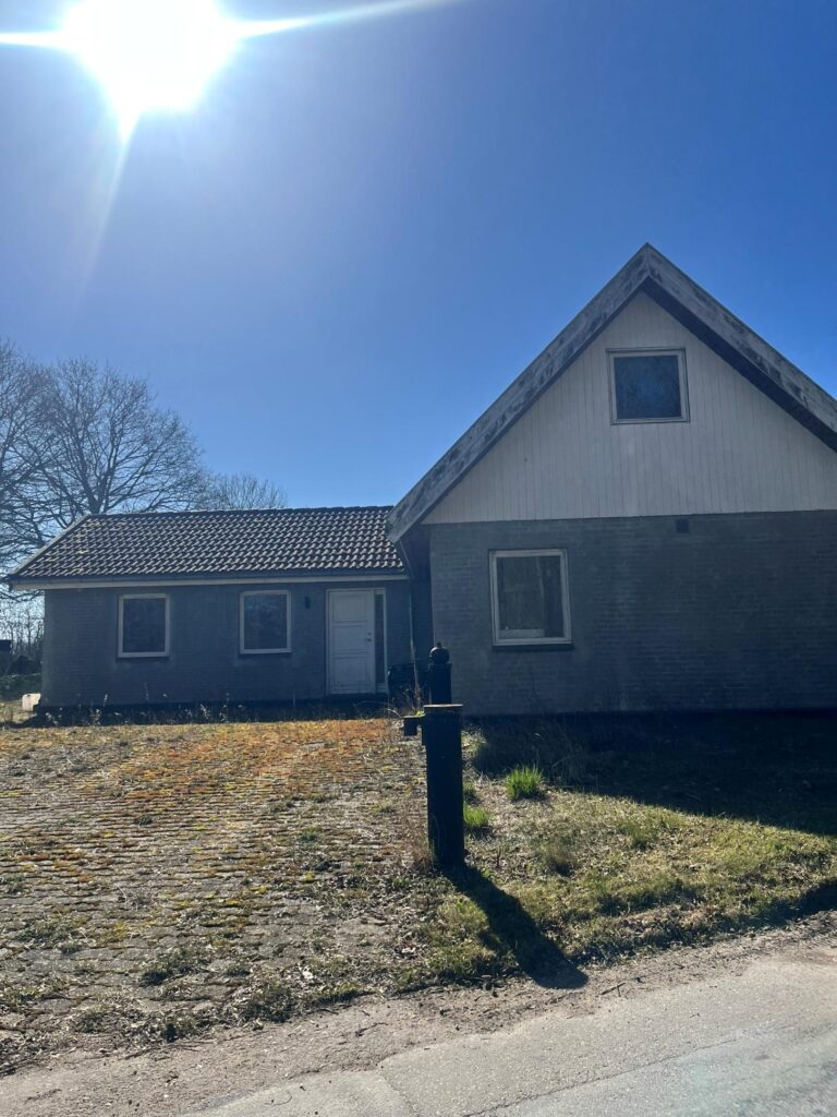 Til venstre for huset er en dobbeltgarage med plads til to biler. Pladsen foran garagen fremstår meget rodet med diverse genstande. Husets facade er forholdsvis velholdt og fremstår med minimale revner. Huset er rødt med sort bølgetag af fibercement. Malingen på husets skorsten fremstår slidt, men er ellers i rimelig stand.