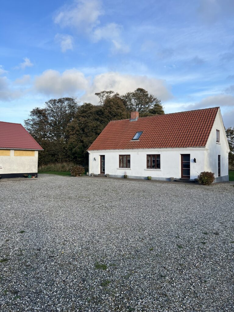 Ejendommen er opført i mursten, der er blevet pudset og med sorte tegl på taget.