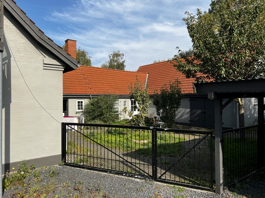 Trelænget ejendom, hvor den ene længe er bolig, den mellemste er fyrrum og separat lejlighed (anført som erhverv i BBR) og sidste længe er hal med højt til loftet og oprindelig garage med hems ovenpå.