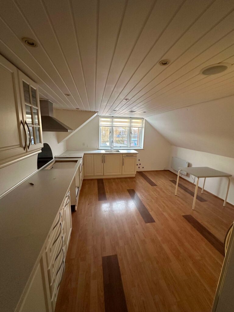 Beboelseslejligheden på 1. sal kan tilgås enten via trappe indenfor hoveddøren i stueetagen eller udefra via den store tagterrasse. Lejligheden på 1. sal består af en fordelingsgang som leder hen til en stue samt 3 øvrige værelser. Derudover rummer lejligheden et stort og moderne køkken samt badeværelse.