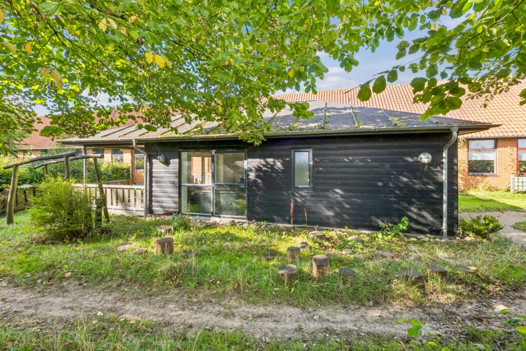 Daginstitutionsafsnittet har en tilbygning fra 2014 i en let konstruktion beklædt med eternitplader uden asbest og listetagpaptag.
