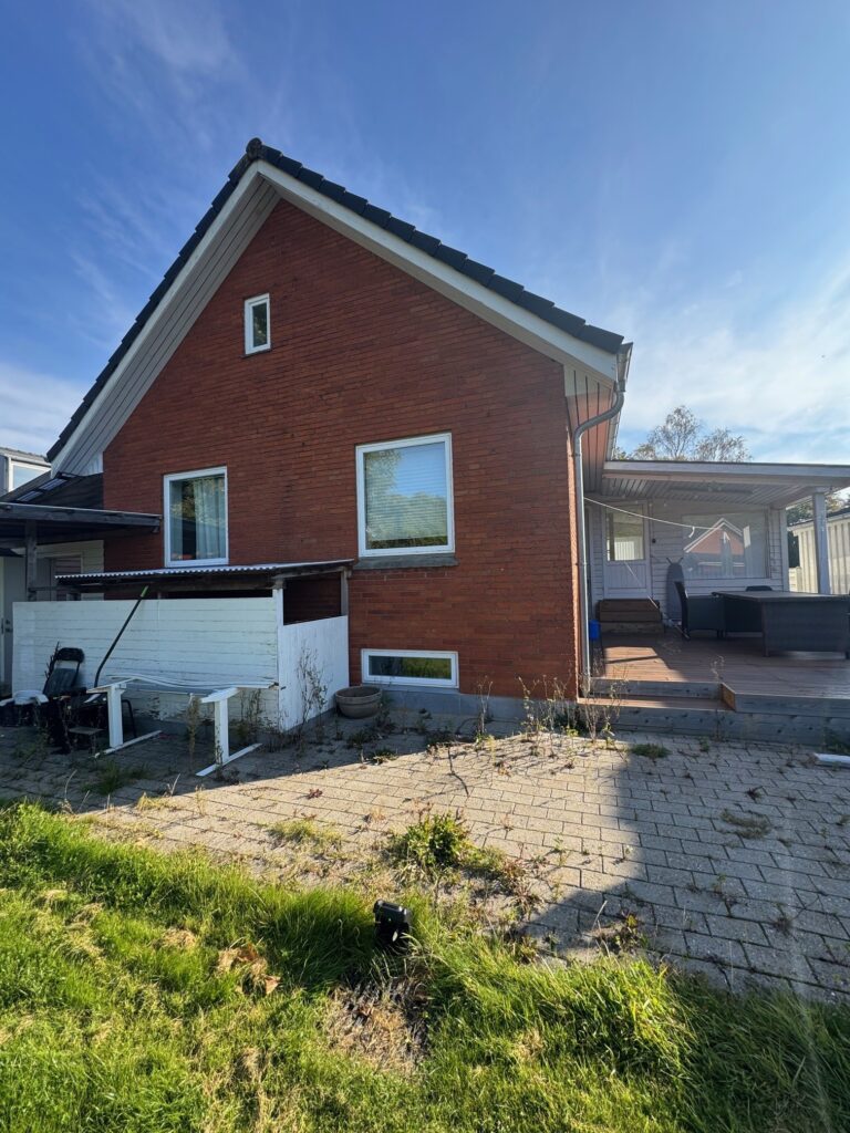 Til ejendommen hører en have med græs og træer samt en flise- og perlestensbelagt indkørsel og forhave.