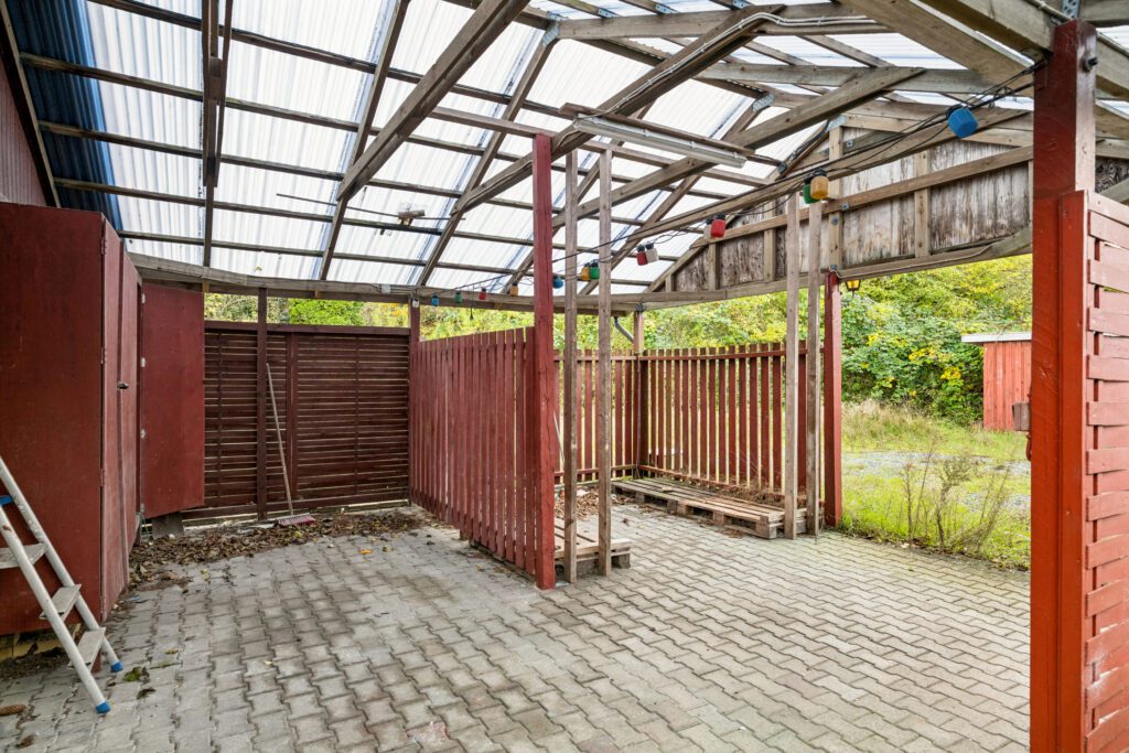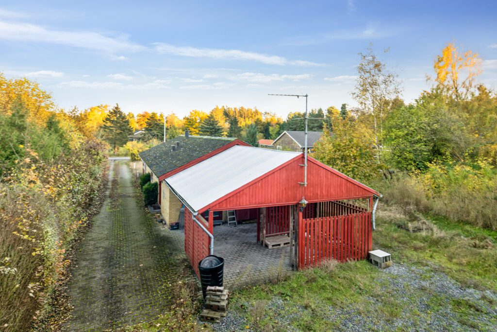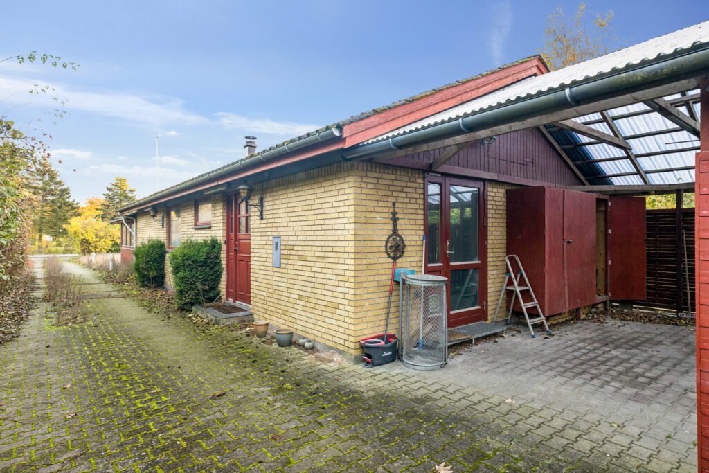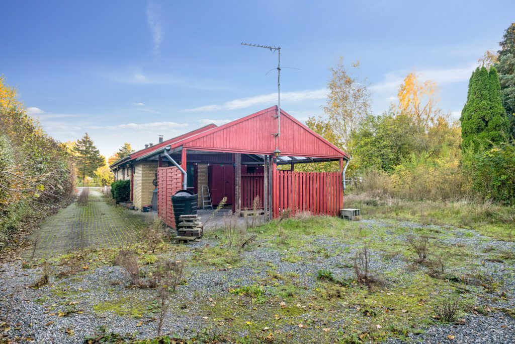 I forlængelse af bygningen ligger ejendommens carport, som iflg. BBR er på 37 m2. Fra carporten kan huset tilgås gennem særskilt indgang til bryggerset. I forlængelse af carporten er der adgang til større areal belagt med småsten/granitskærver, som giver mulighed for opbevaring og parkering af køretøjer m.v. Herfra er der videre adgang til ejendommens græsplæne og flisebelagte terrasse, ligesom der er adgang til ejendommens resterende to bygninger, som ifølge BBR er registreret som udhuse på henholdsvis 9 og 7 m2 men som fremstår indrettet til opbevaring, ligesom det ene har været anvendt som mindre værksted.