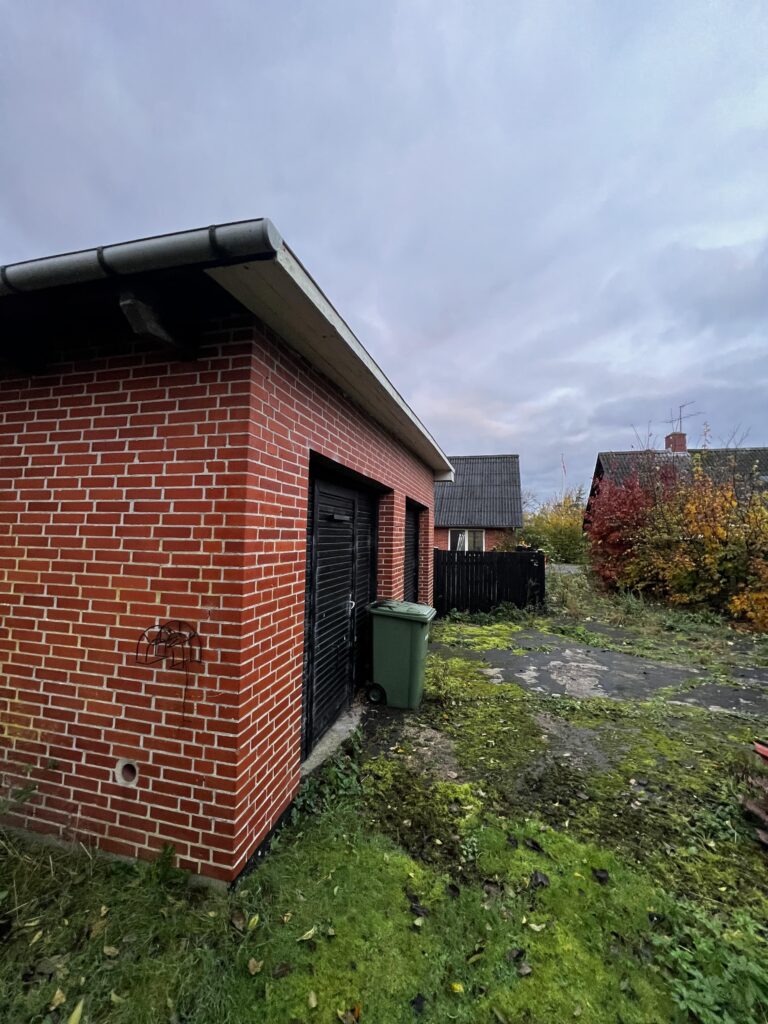 Garage: med betongulv, hvidpudset vægge, samt hvidmalet/gips loft. Der er to garageporte i træ med udgang til bagsiden af bygningen. I garagen er der opmuret separat rum med plads til opbevaring, med betongulv, hvidpudset vægge, hvidmalet/gips på loft, samt et enkelt vindue.
