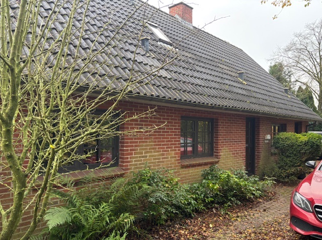 Ejendommen er opført i røde mursten med mørke trævinduer/døre og cementtagsten. Grunden er ifølge BBR på 1055 m².