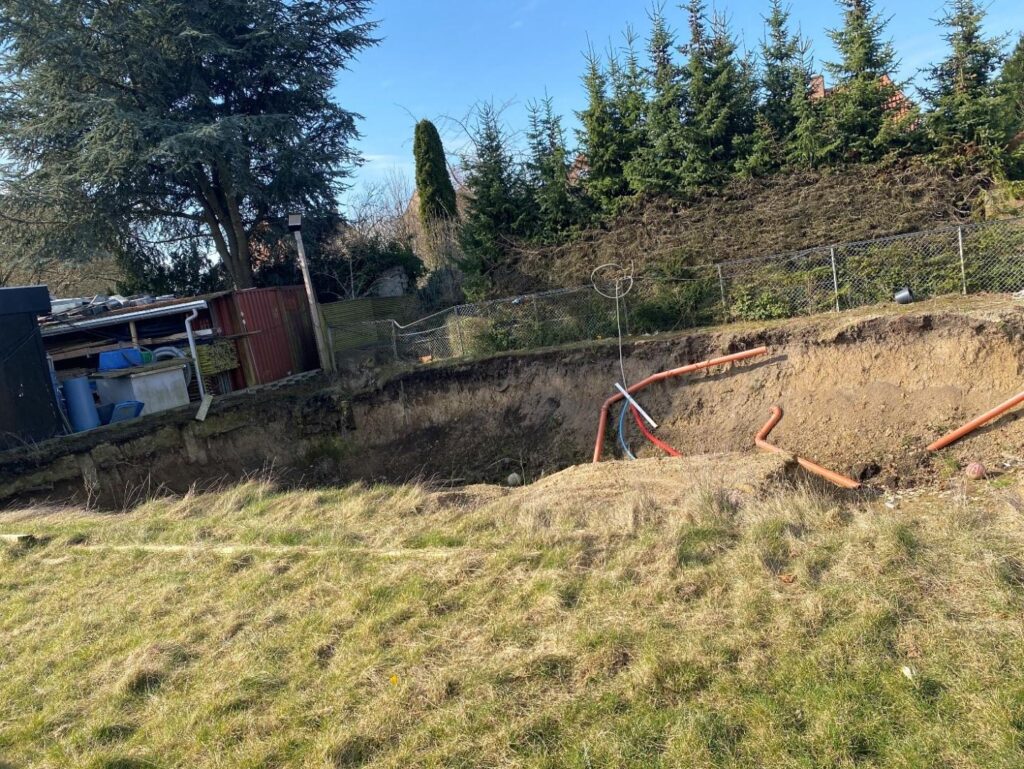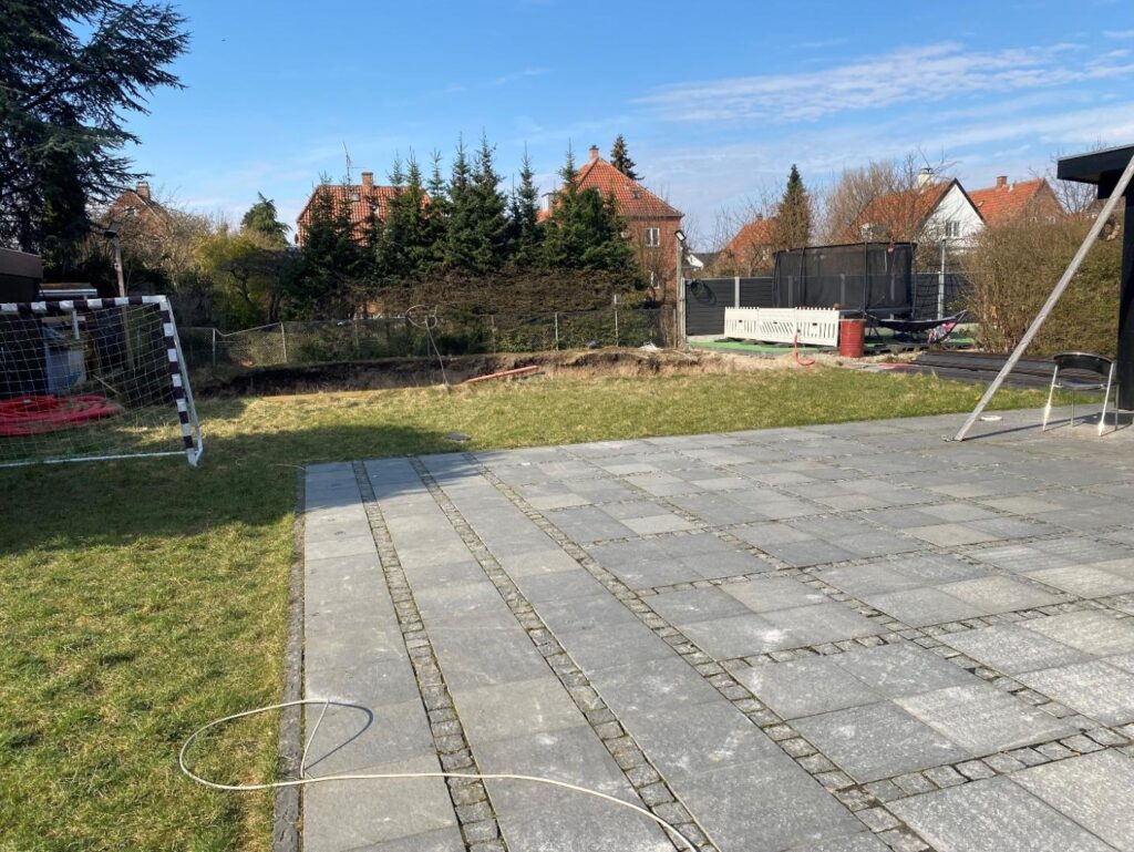 Der mangler belægning omkring ejendommen, og der er større jordbunker på grunden. Bagerst i haven er der etableret et større hul, hvor der var planlagt en swimmingpool.