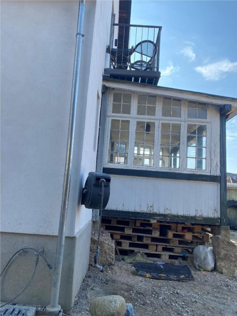 Ejendommen mangler hovedtrappe til hoveddøren, hvorfor adgang sker via kælderdøren.