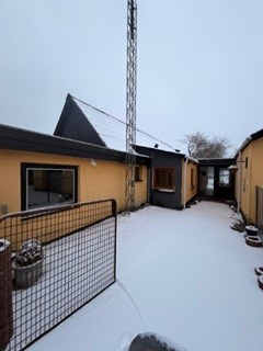 Gulpudset ejendom indeholdende indgangsparti, hvorfra der er adgang til både garage og beboelseshuset.