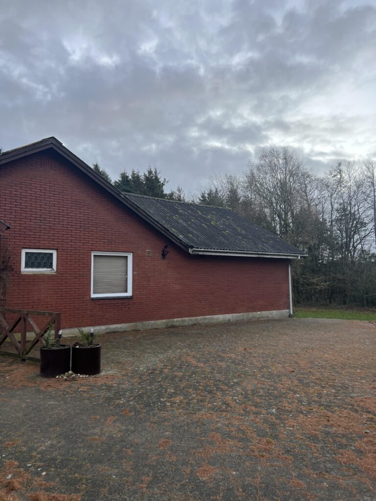 Til højre for stuehuset forefindes en stor bygning, som indeholder carport, gildesal, fyrrum samt et stort maskinhus. Fra indgangen til bygningen træder man direkte ind til carporten. Til højre for carporten er der en dør ind til gildesalen, og til venstre for carporten er der en dør til et fyrrum. Fra fyrrummet adgang til stor maskinhal. Se nedenfor, og som fremgår af BBR-meddelelsen.