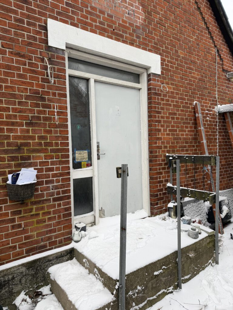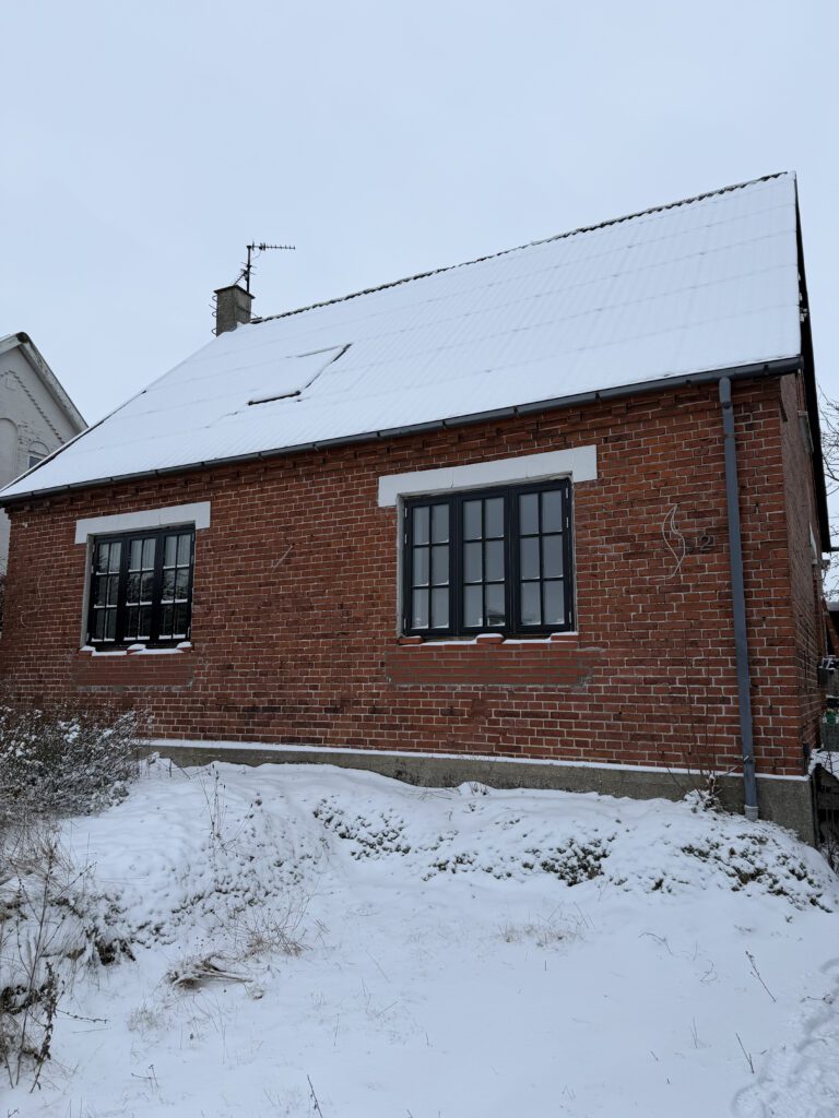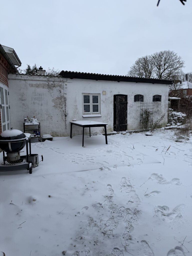 Huset fremstår fraflyttet ved besigtigelsen den 27. januar 2026, men der er efterladt en betydelig mængde indbo, herunder legetøj, senge, sofa, reoler, kommoder, madvarer, elkedel, mikroovn, airfryer, fritstående radiatorer, to udendørs grill (Weber og Charbroil), TV samt beklædningsgenstande.