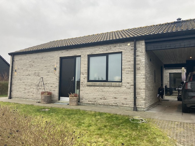 Der er to adgangsdøre til ejendommen. Hovedindgangen leder ind til en entré i direkte forbindelse til en fordelingsgang. Bagindgangen findes ved indbygget carport og leder ind til et bryggers.