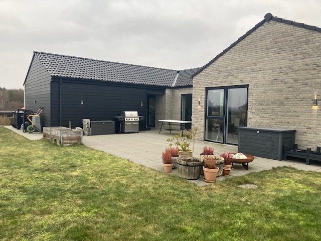 Fra haven er der adgang til et overdækket skur med tre rum, det største bestående af et værksted, mens de andre er til opbevaring.