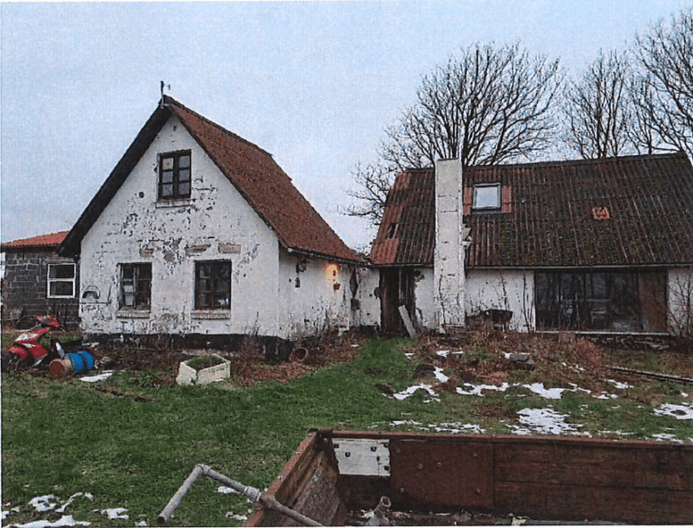 Rødmalet murstenshus med stråtag. Det samlede bygningsareal udgør 88 m². Ejendommen er ikke vedligeholdt. Haven er bevokset, og der forefindes to drivhuse, der også er forsømte.