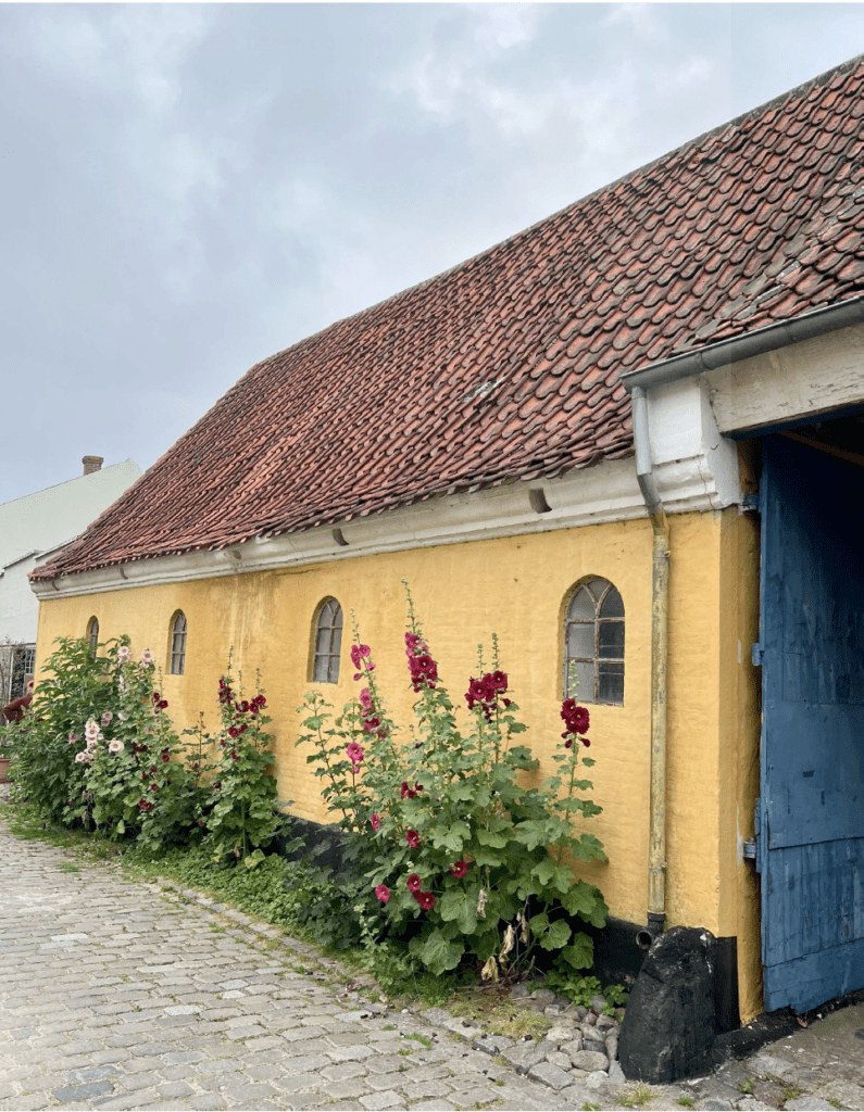 Ejendommen er opført i gule mursten med store vinduespartier mod vejen.