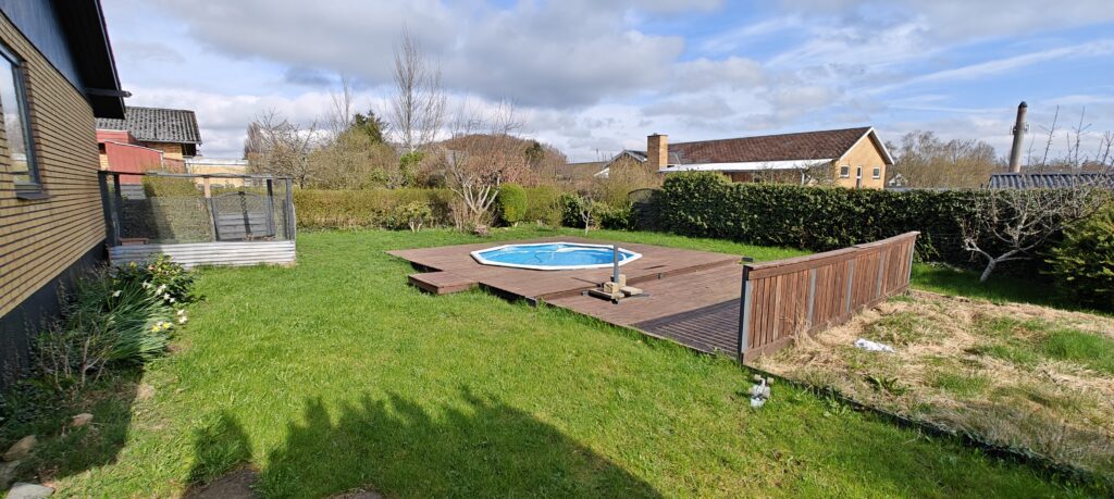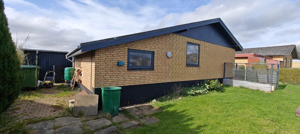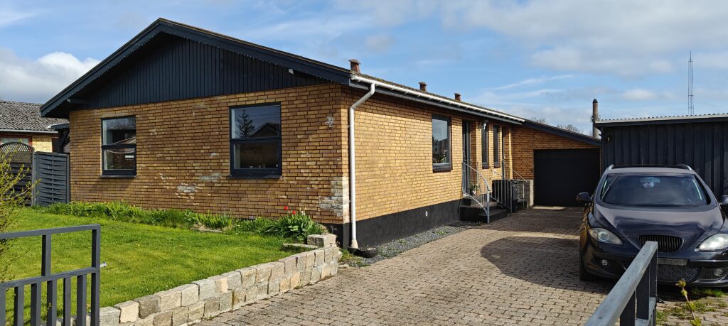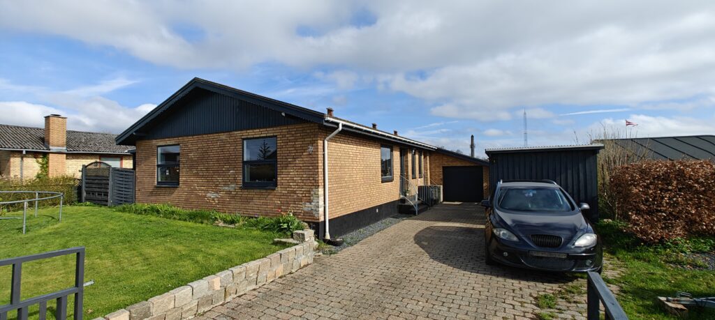 Udvendigt er huset et gult murstenshus i klassisk 70’er stil med dele af gavlene i træ og tag af tagplader. Grunden er med egen indkørsel og god plads til flere biler. Foran huset finder man en lukket garage med port, samt et større skur. Forhaven vender mod sydvest, og baghaven mod nordøst. Mod vest findes en overdækket terrasse og i baghaven er der en træterrasse med en indbygget rund pool i midten.