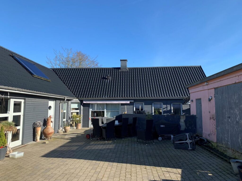 På taget ses solfangeranlæg, der efter det oplyste ikke er tilsluttet pga. en defekt.