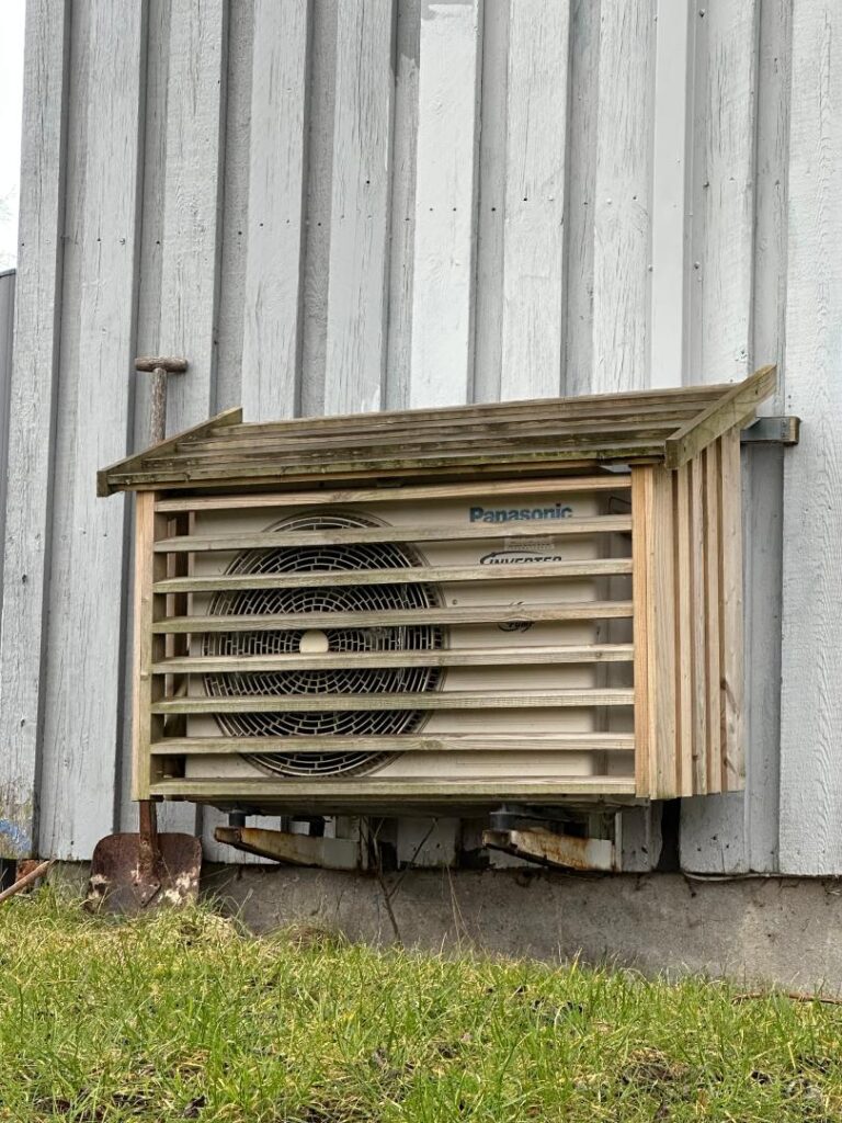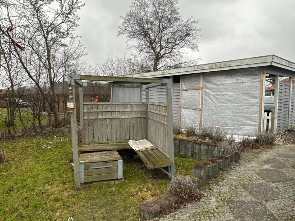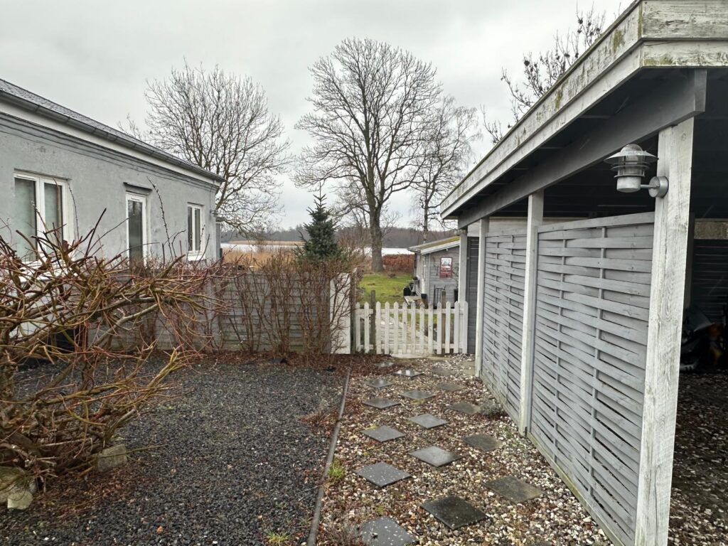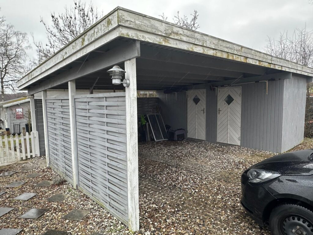 Ved indkørslen til ejendommen ankommer man til en grusbelagt plads med plads til flere biler. Herefter følger en carport med plads til to biler. I tilknytning til carporten er der to skure med hver sin hvide trædør. Carporten er opført i gråmalet træ og har metaltag. Træbeklædningen omkring carporten op mod taget har grønne algebelægninger.