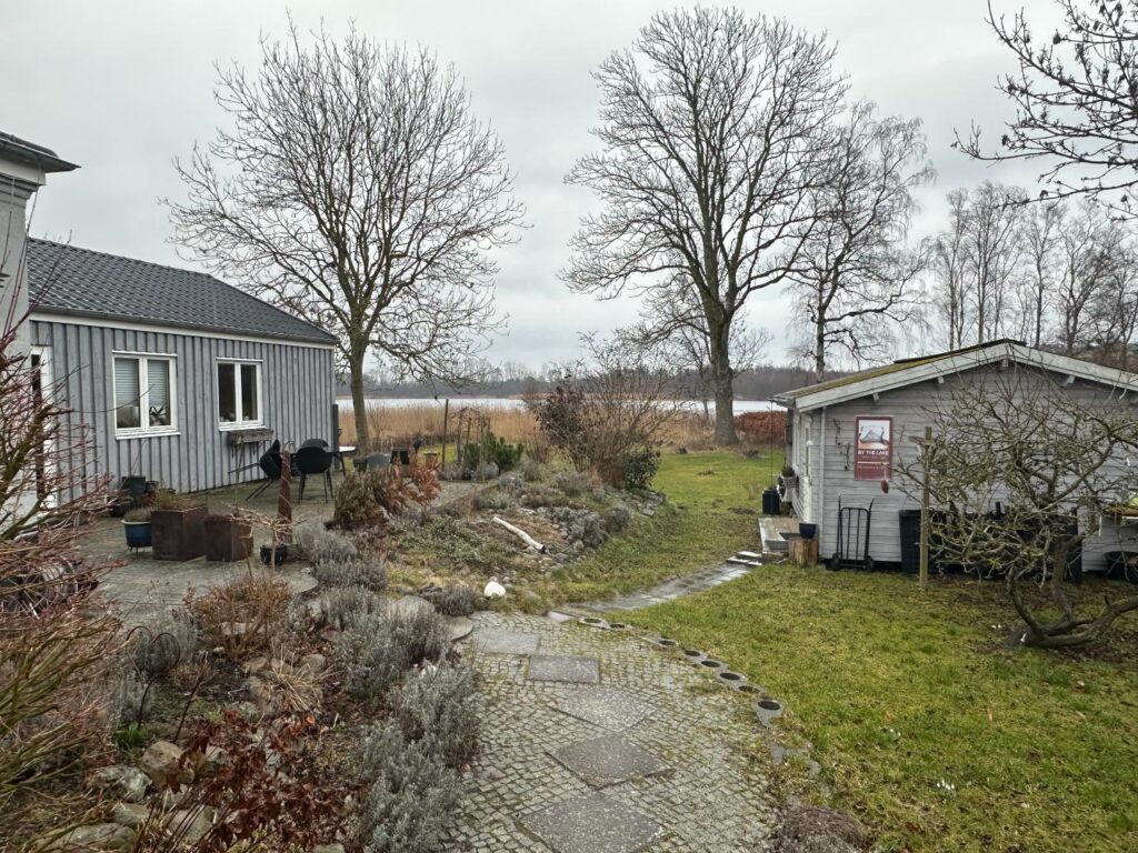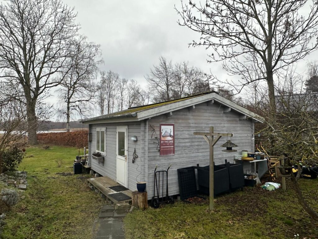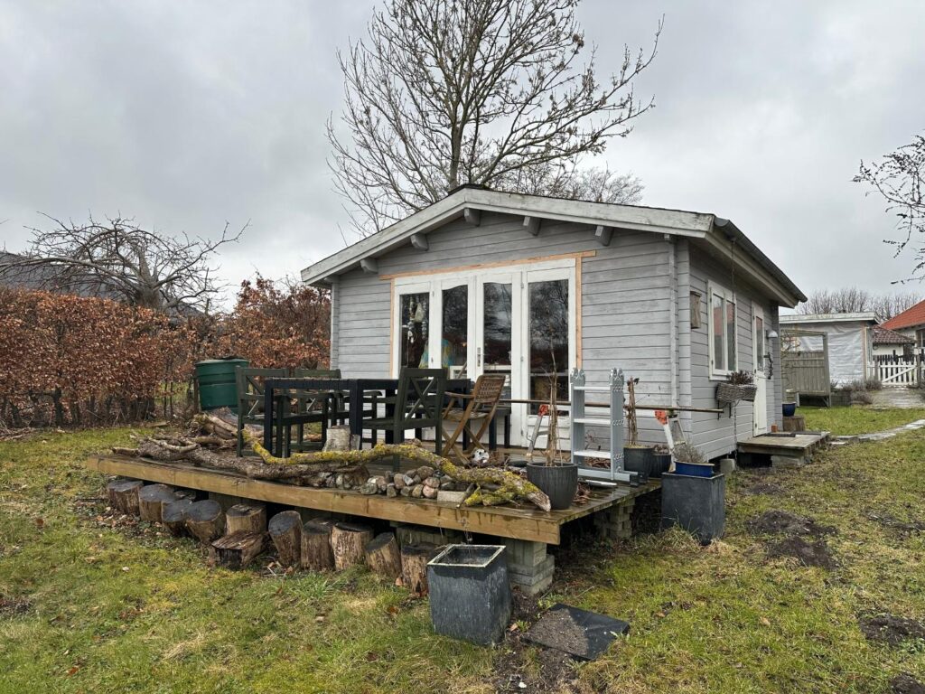 Ved siden af carporten er der en flisebelagt sti, som fører hen til huset. Dernæst er der på højre side et udhus. Udhuset er opført i gråmalet træ og har tagpaptag med algebelægninger. Udhuset har to døre. Den ene fungerer som indgang, mens den anden er en dobbeltdør med aflange vinduer på hver side. Dobbeltdøren fører ud til en træterrasse.