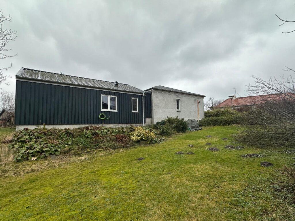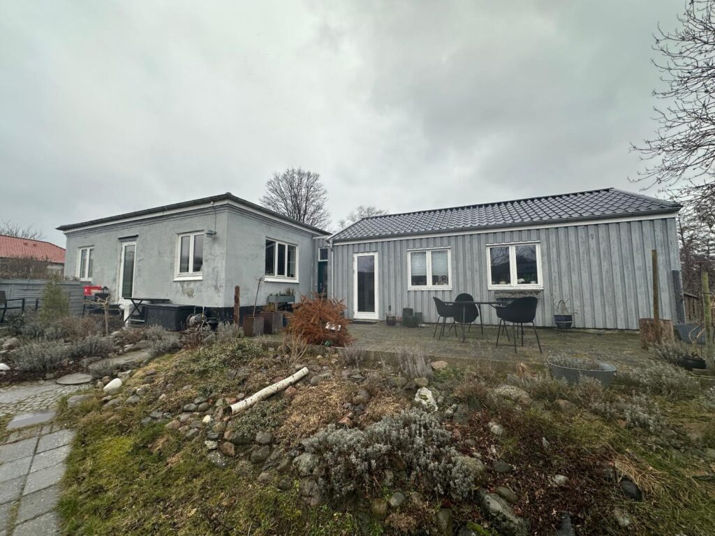 Foran tilbygningen er der en flisebelagt terrasse. Taget er ligeledes af fibercement. Tilbygningens ydremateriale er træ. På to af tilbygningens sider er træet malet lysegråt, mens nordsiden er malet mørkegråt.