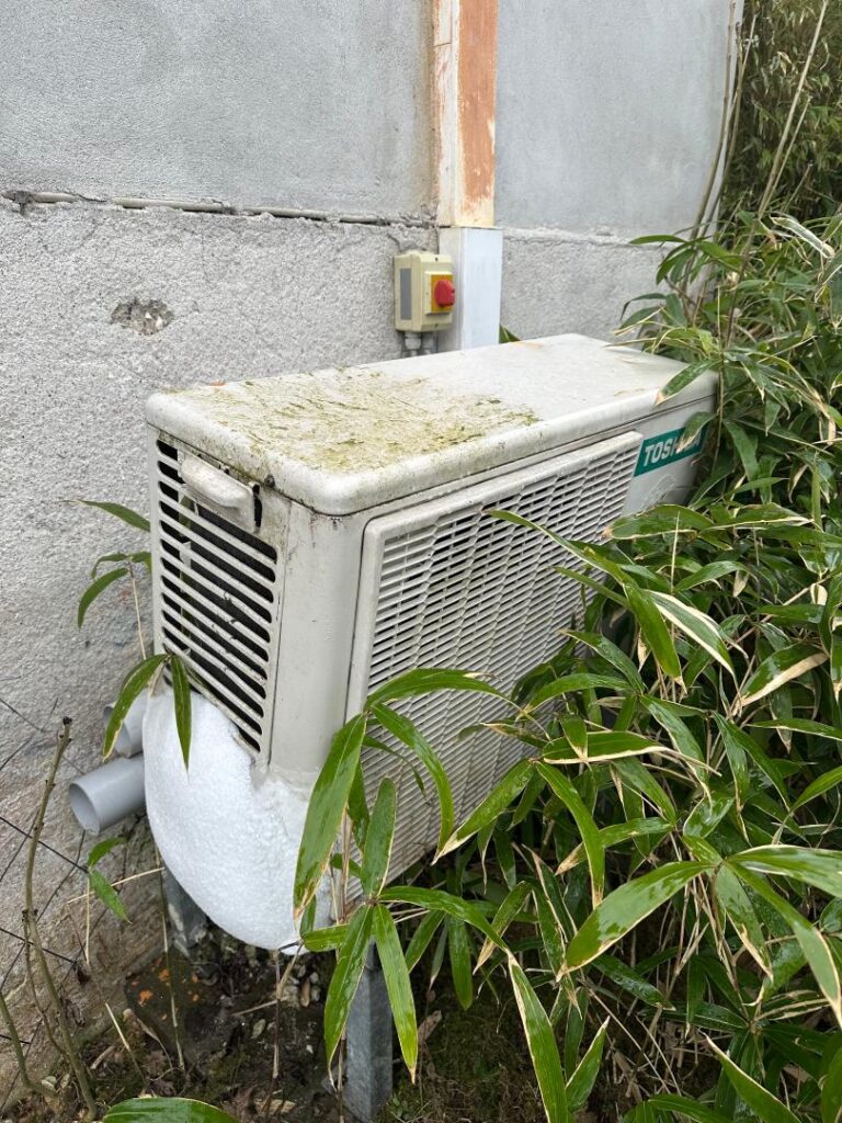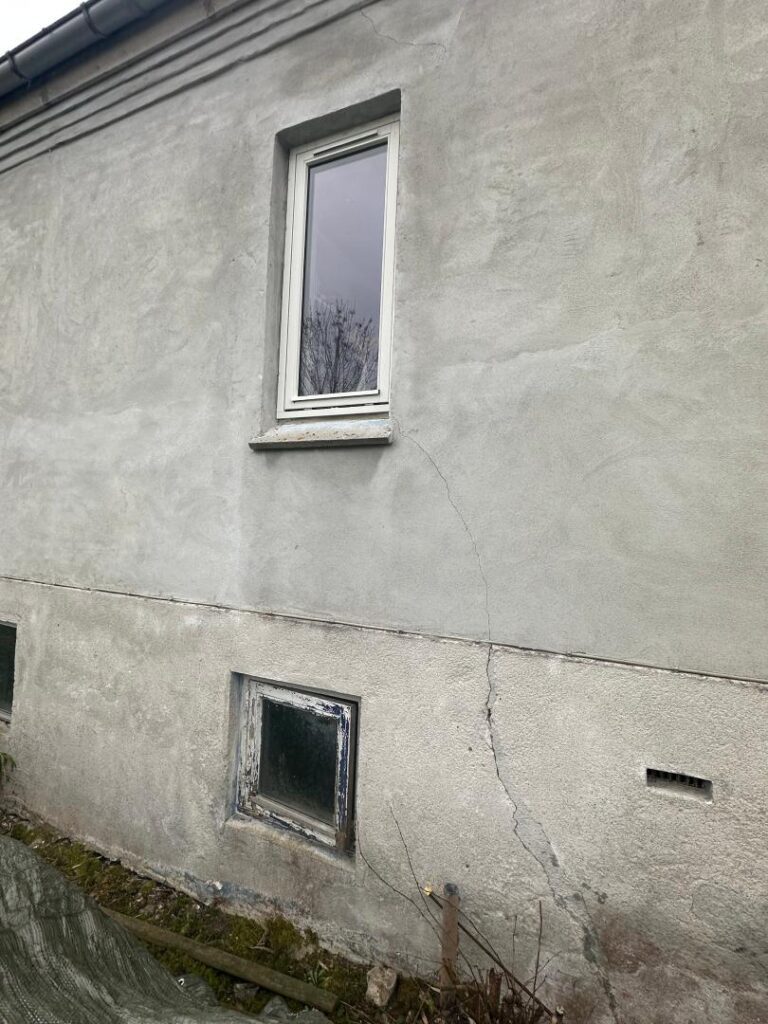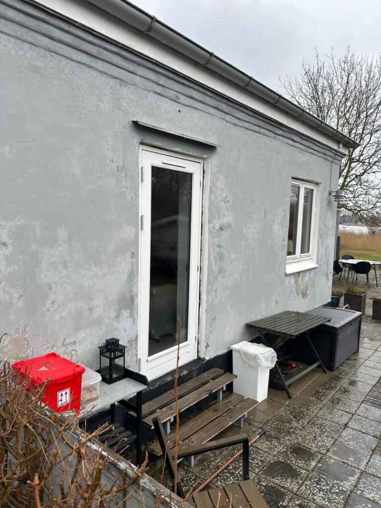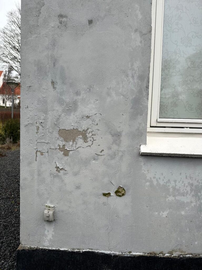 På nordsiden af hovedhuset ses en større sprække i pudset. Her er tillige et lille kældervindue i træramme, som er i dårlig stand.