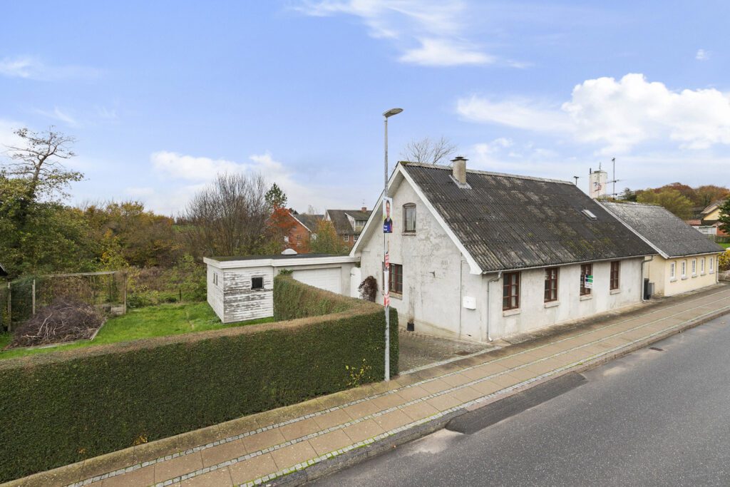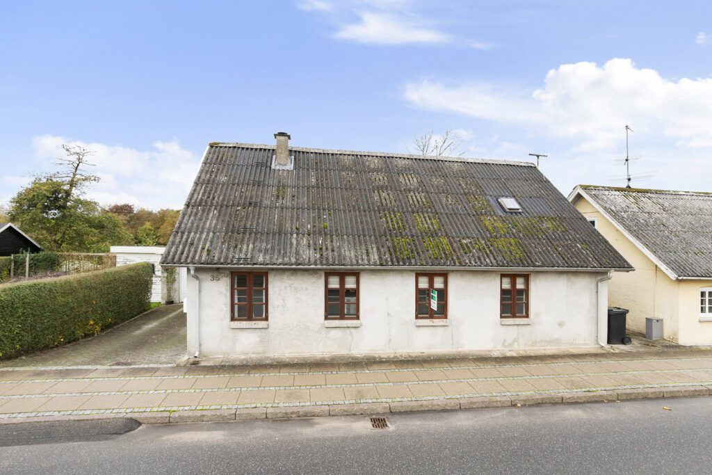 Ejendom med pudset facade og sort eternittag.