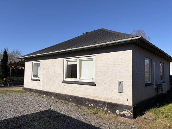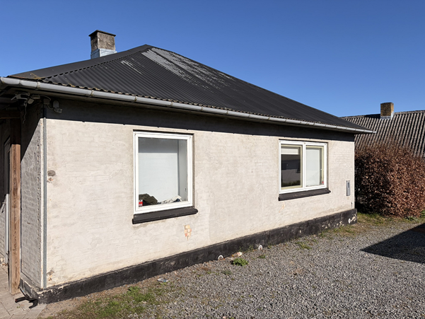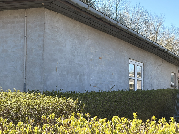 Ejendommens ydervægge fremstår med pudsede mursten. Generelt fremstår facaden med mindre afskalninger. Taget er ifølge BBR registreret som fibercement (med asbest), hvilket også ses at være tilfældet ved rekvirentens besigtigelse.